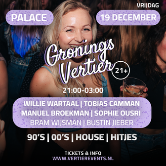 Op 19 december gaan we extra groot met Gronings Vertier XL in Palace. Met Willie Wartaal van De Jeugd van Tegenwoordig, Tobias Camman, Manuel Broekman én Sophie Ousri op het programma belooft het een knallende avond te worden. Verwacht de lekkerste hitjes, 90’s, 00’s en house in een club vol gezelligheid!